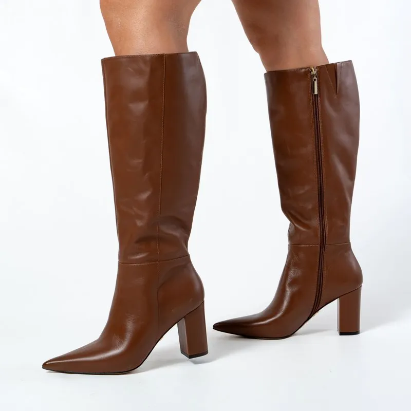 A bota Zoe de cano alto em couro é a escolha perfeita para quem busca sofisticação e versatilidade. Com design minimalista, bico fino e salto bloco médio na altura de 8cm, ela proporciona estabilidade e estilo para qualquer ocasião. O fechamento lateral em zíper garante praticidade e um calce rápido.